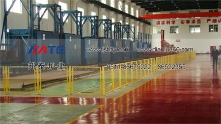 本套淬火機(jī)組有多臺鐘罩式電阻爐與一臺淬火操作車組合為一個快速淬火機(jī)組生產(chǎn)線,一個機(jī)組可以根據(jù)用戶的產(chǎn)量和工藝要求配套幾臺不同的爐型,爐子的數(shù)量和爐型可以自由組合,本生產(chǎn)線可滿足不同的生產(chǎn)工藝如:淬火、回火、退火、調(diào)質(zhì)等熱處理工藝,爐溫有1200℃,950℃,700℃等,每條生產(chǎn)線配有一臺快速下水淬火操作車,該操作車可上下、左右、前后六個方向移動,工件熱處理完成后,操作車迅速進(jìn)入爐內(nèi)將工件從爐膛內(nèi)叉出,并快速落入水池或淬火液池內(nèi),整個過程在1分鐘內(nèi)完成,生產(chǎn)效率高,操作方便,從而保證了工件的淬火質(zhì)量。