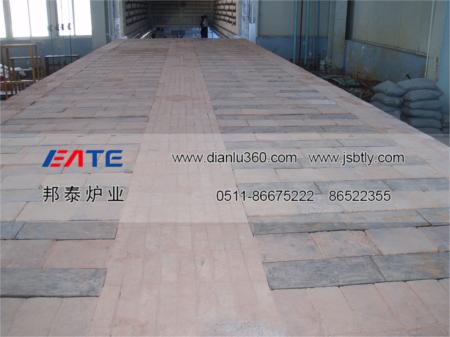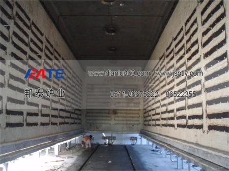 爐襯采用全纖維大板塊結(jié)構(gòu)吊掛在鋼骨架上,承重部分采用重質(zhì)耐火磚砌筑,以增強(qiáng)爐襯的結(jié)構(gòu)強(qiáng)度。臺(tái)車(chē)保溫層采用硅酸鋁耐火纖維、硅藻土保溫磚復(fù)合節(jié)能結(jié)構(gòu),以提高爐體的保溫節(jié)能性能。