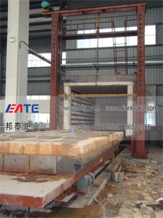 5、臺車耐火砌體采用高鋁定型磚結(jié)構(gòu),與爐體密封效果好,耐壓強度高。臺車面擱置墊鐵供堆放工件用。臺車幫板全部采用澆筑件,保證車體不變形及耐用性。爐車與爐襯的密封采用耐火纖維密封塊電動推桿自動壓緊結(jié)構(gòu)。側(cè)密封的開、閉與爐車進出連鎖。