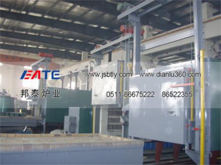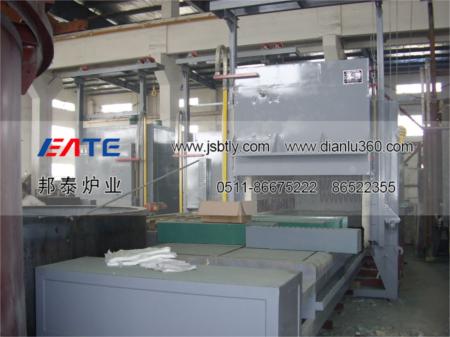 臺(tái)車框架采用型鋼焊接成形,其鋼性保證在滿負(fù)荷下不變形。內(nèi)用耐火磚砌筑,易碰撞部位和承重部位用重質(zhì)磚砌筑,增強(qiáng)爐襯結(jié)構(gòu)強(qiáng)度,臺(tái)車的行走采用自行式結(jié)構(gòu),由減速機(jī)傳動(dòng)鏈輪帶動(dòng)走輪在軌道上行走。臺(tái)車密封采用自動(dòng)迷宮式結(jié)構(gòu)和軟接觸雙密封,臺(tái)車進(jìn)入爐內(nèi)通過凸輪及滾輪斜面作用,自動(dòng)升起后進(jìn)行密封。臺(tái)車開出,該密封槽自動(dòng)落下,密封槽內(nèi)密封砂經(jīng)加滿后即不必經(jīng)常添加。臺(tái)車開出,爐門升降均為電動(dòng)控制,配有電磁制動(dòng)器,可防止慣性撞擊爐體,并且連鎖控制,即稍打開爐門后,自動(dòng)切斷加熱元件,同時(shí)恢復(fù)臺(tái)車行走機(jī)構(gòu)電源。爐門關(guān)閉到位后,自動(dòng)切斷臺(tái)車行走機(jī)構(gòu)電源,同時(shí)恢復(fù)加熱元件電源。
